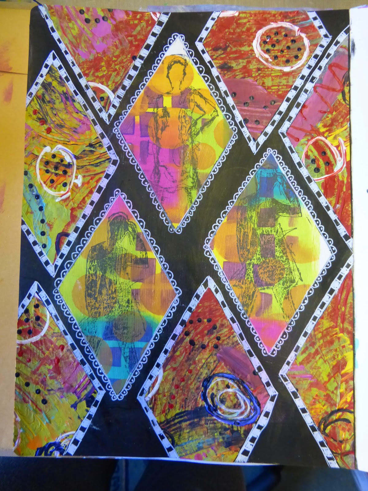 Day three was all about techniques, reverse stenciling and masking, image transfer, using Vaseline as a resist, dripping paint, glazing plus others, I found this day very useful, especially for when you are stuck for something to do, just refer back to these techniques to jump start creativity.